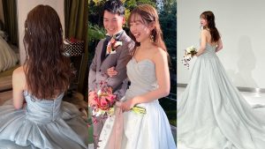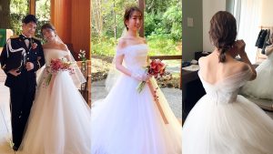 披露宴入場で生花をプラス、ドレスのパーツのオフショルダーをチェンジすると印象に変化が出ます