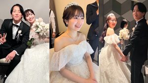 挙式はシニヨンにティアラ、披露宴入場でハーフツインにパールとキラキラシールでアレンジ