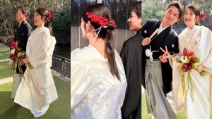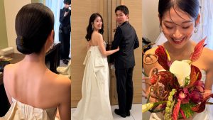 挙式はタイトなシニヨン、前髪は束にして流してスタイリッシュに