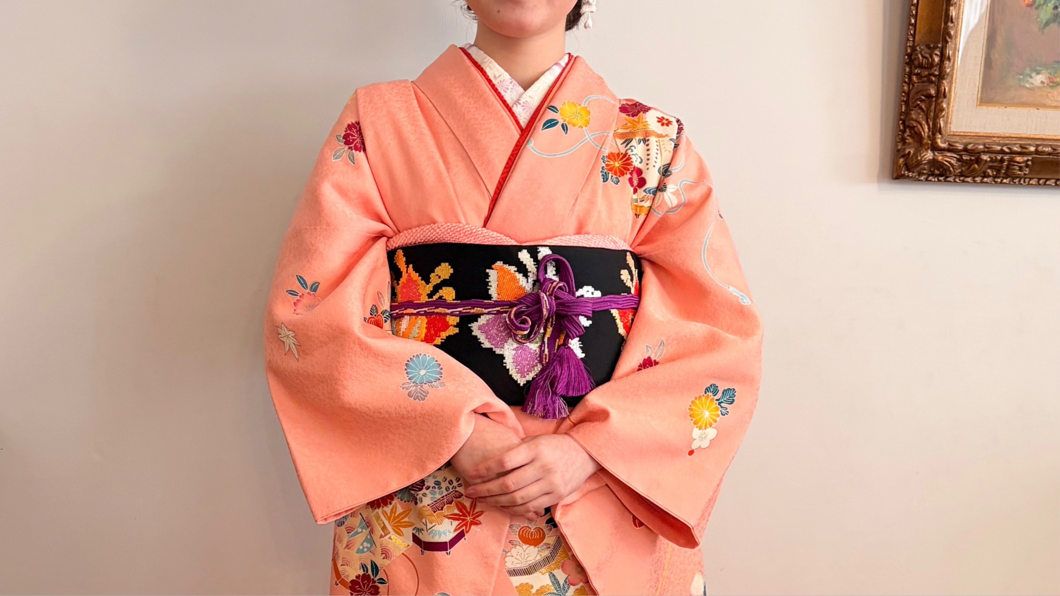 帯は柄が出るように3段フリルの結び方にしてレトロモダンなアレンジに